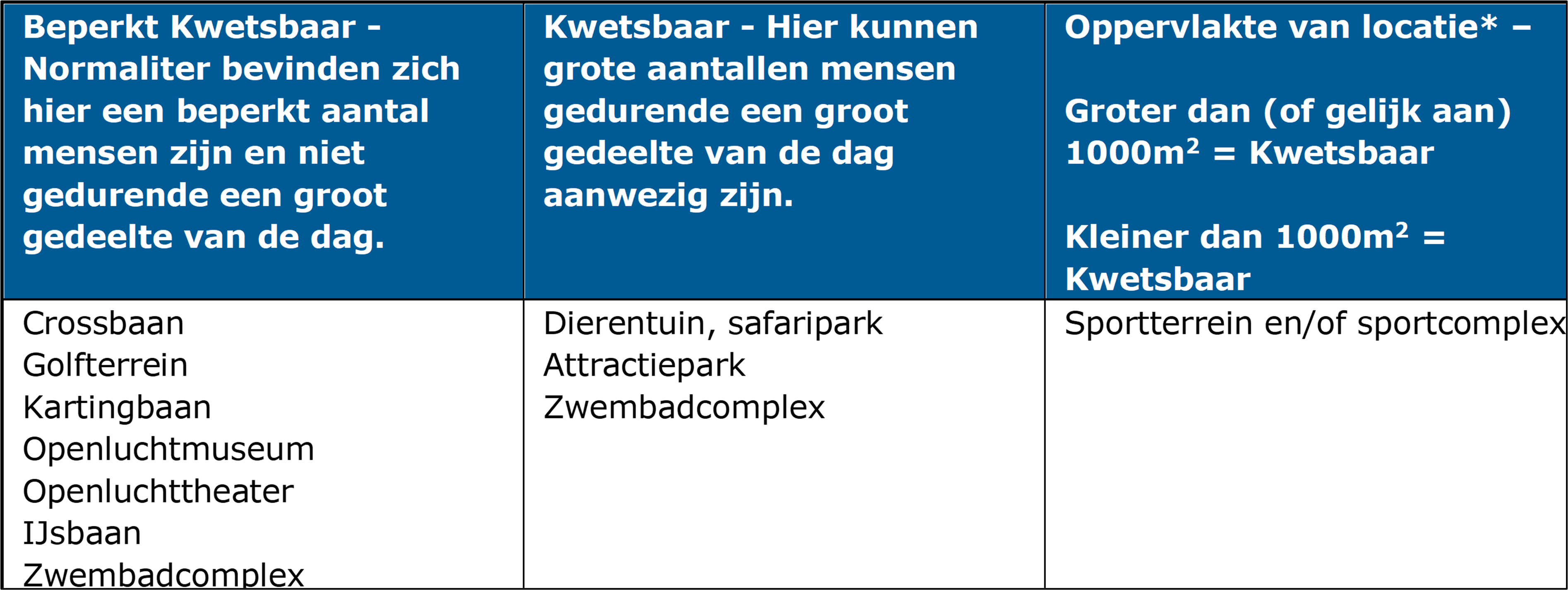 * Of er een groot aantal mensen aanwezig is wordt bepaald aan de hand van PGS-1 (deel 6). Deze richtlijn stelt dat bij een sportfunctie 20 m2 per persoon gebruikelijk is. Indien het gebruiksoppervlak van het sportcomplex meer dan 1000 m2 bedraagt wordt de aanname gedaan er meer dan 50 mensen aanwezig zijn. Daarmee wordt de locatie als kwetsbaar aangeduid. Omgekeerd wordt bij een kleiner aantal personen een locatie als beperkt kwetsbaar geclassificeerd Uiteraard kan de bijbehorende kantine een andere aanduiding krijgen. Deze is terug te vinden onder kwetsbare gebouwen.